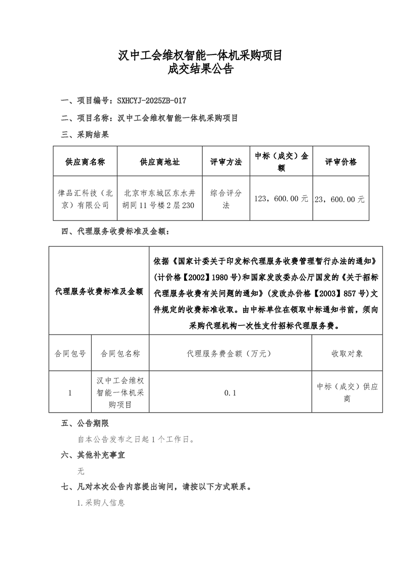 汉中工会维权智能一体机采购项目成交结果公告