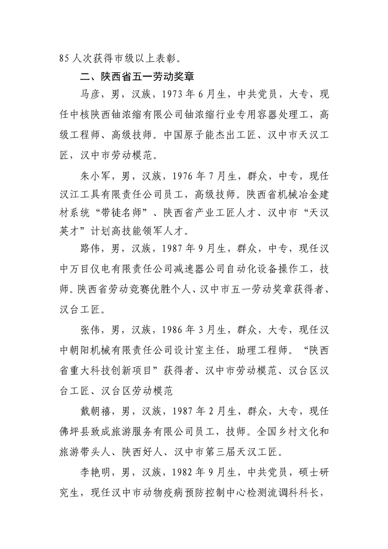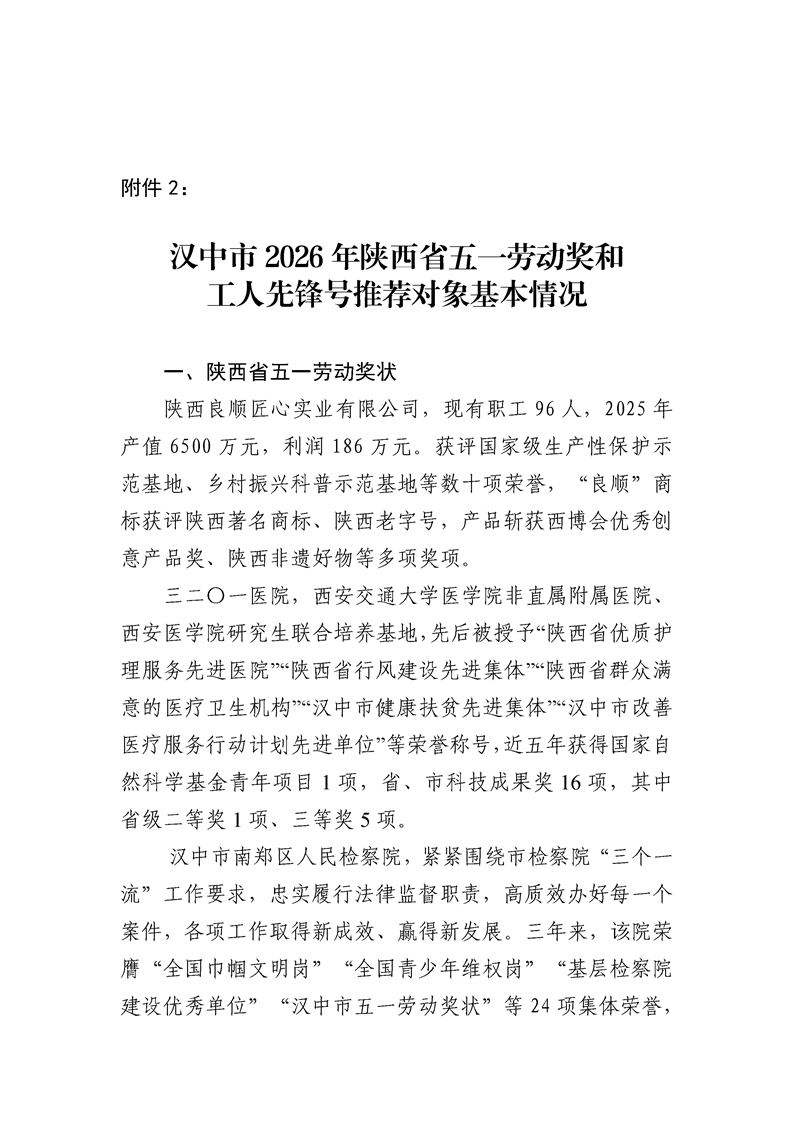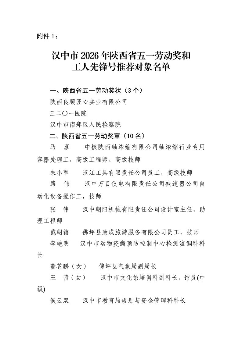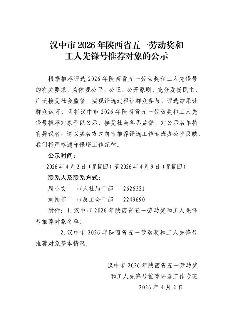汉中市2026年陕西省五一劳动奖和工人先锋号推荐对象的公示